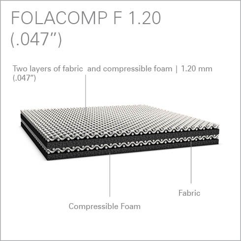 The Folacomp range was specifically developed for use underneath Folacoat coating plates and offers a wide range of thicknesses of underpacking containing a high percentage of compressible components. The content of smash-sensitive fabrics is considerably reduced in comparison with conventional compressible rubber underpacking blankets. The large number of thicknesses available makes it possible to use just one layer of underpacking in combination with the respective Folacoat coating plate. Packings made up of several sheets of paper belong to the past. The Folacomp F is a non-adhesive version of our flexible underpacking and consists of several layers of rapid-recovery foam and fabric.